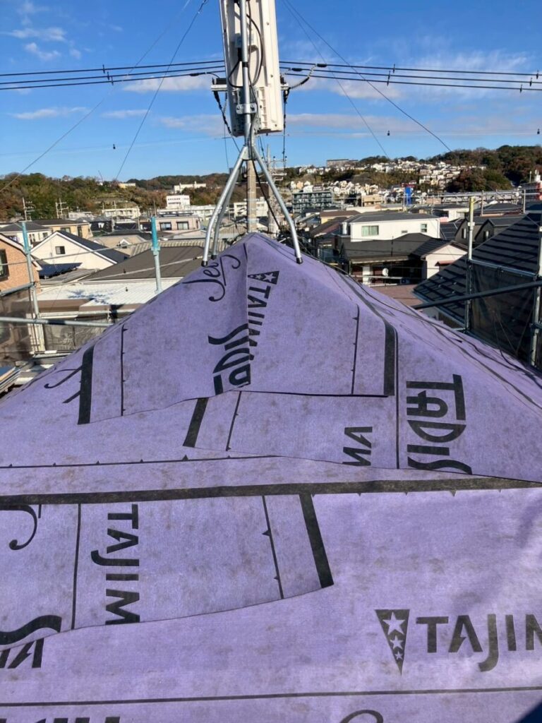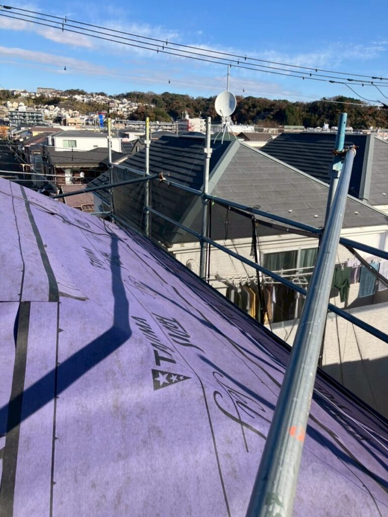 まずは既存屋根の上から防水シート(ルーフィング)を施工。