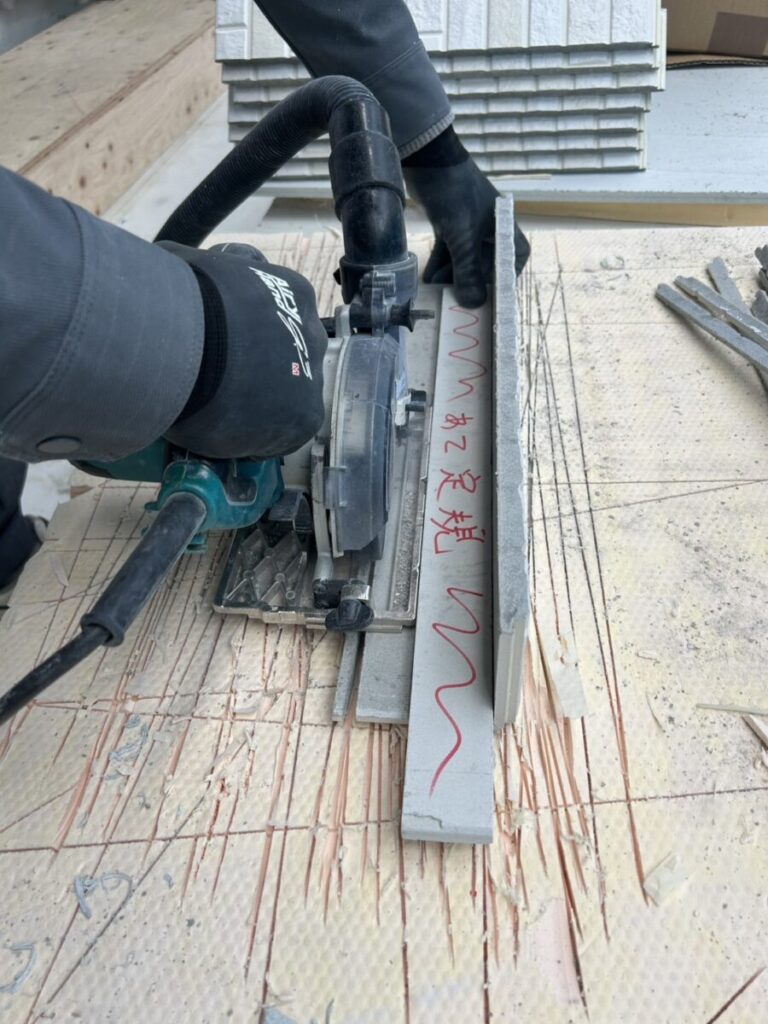 カットする寸法に合わせて、サイディングの端材(破材)を使い、現場専用のあて定規を作ります。これを使うことで寸法がズレにくくなり、カット作業もスムーズ。仕上がりも安定します。