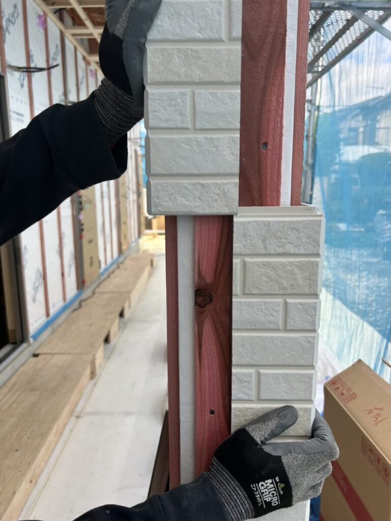 写真では仮に当ててるだけですが、実際に外壁に仕上げるときは真ん中の隙間はコーキングしろになります。
