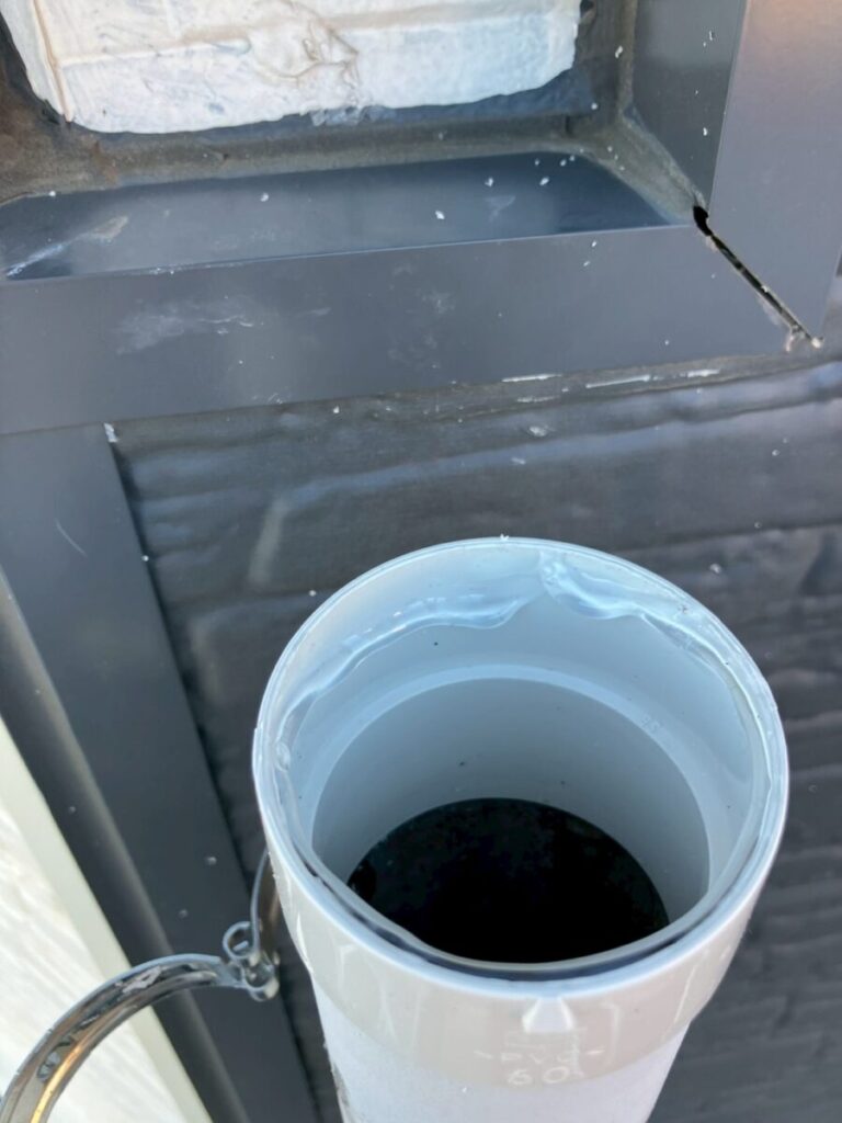 今日は、集水器に接続されている竪樋(たてどい)が外れているとのことで、集水器と堅樋を正しく接続する工事をしました!