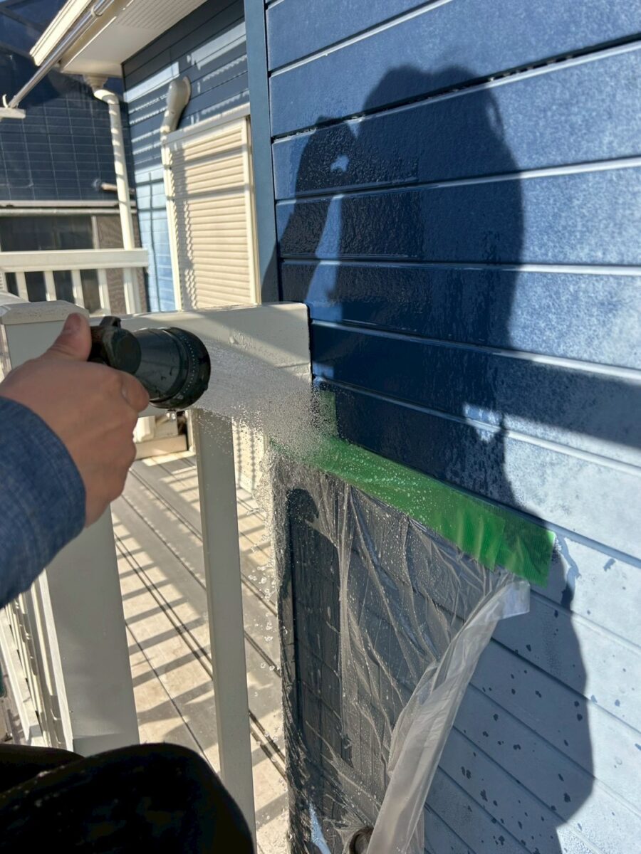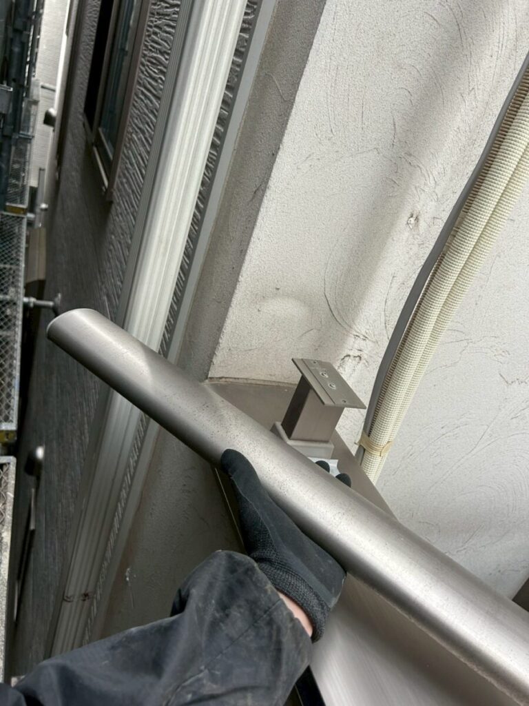 特にベランダの手すりは、そのままでは新しい外壁と位置が合わなくなってしまうため、一度取り外し、外壁の出幅に合わせて約4センチカットしてから、丁寧に取り付け直しています。