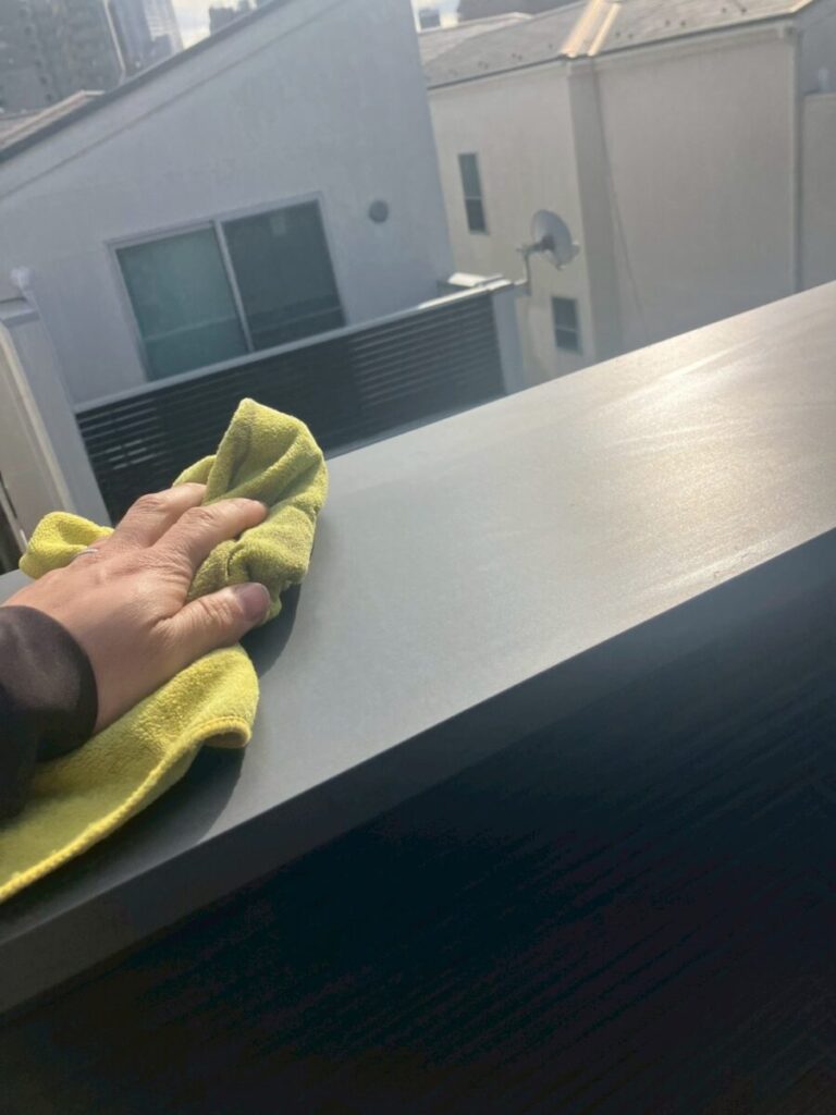 固定後は浮きやズレがないかを入念にチェックし、最後に笠木についた手垢や汚れを丁寧に拭き取り。