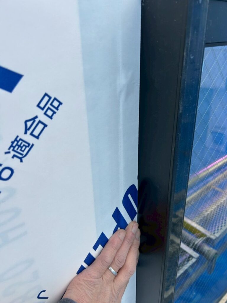 サッシにしっかり押し付けながら、テープとシートが一体になるように施工。