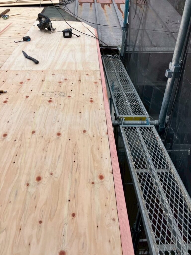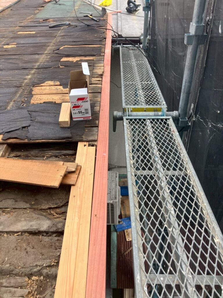 その後、既存の野地板を戻したうえで、新しい野地板を重ね打ちしています。