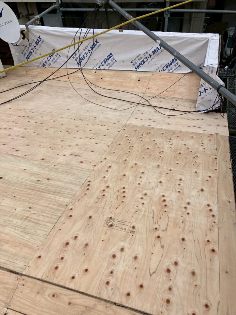 ここは屋根の強度を左右する大事な部分なので、一枚一枚状態を確認しながら丁寧に張っていきます。