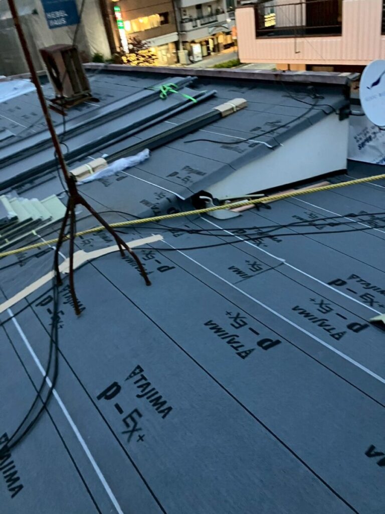 その後、防水シートには高耐久のルーフィングEXを使用。シワやたるみが出ないようピンと張り、重ね幅もきちんと確保しています。これで雨仕舞いは万全。