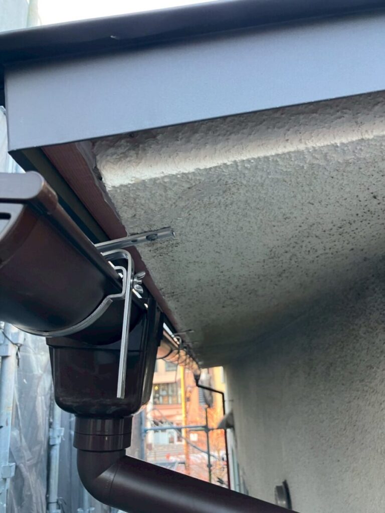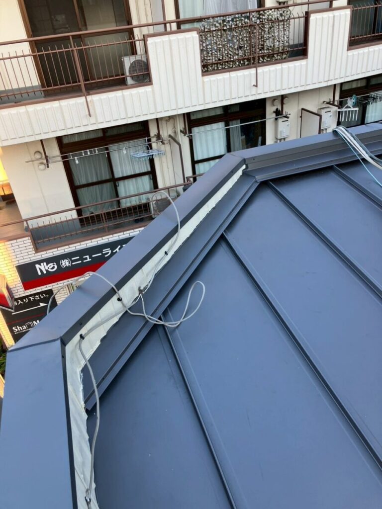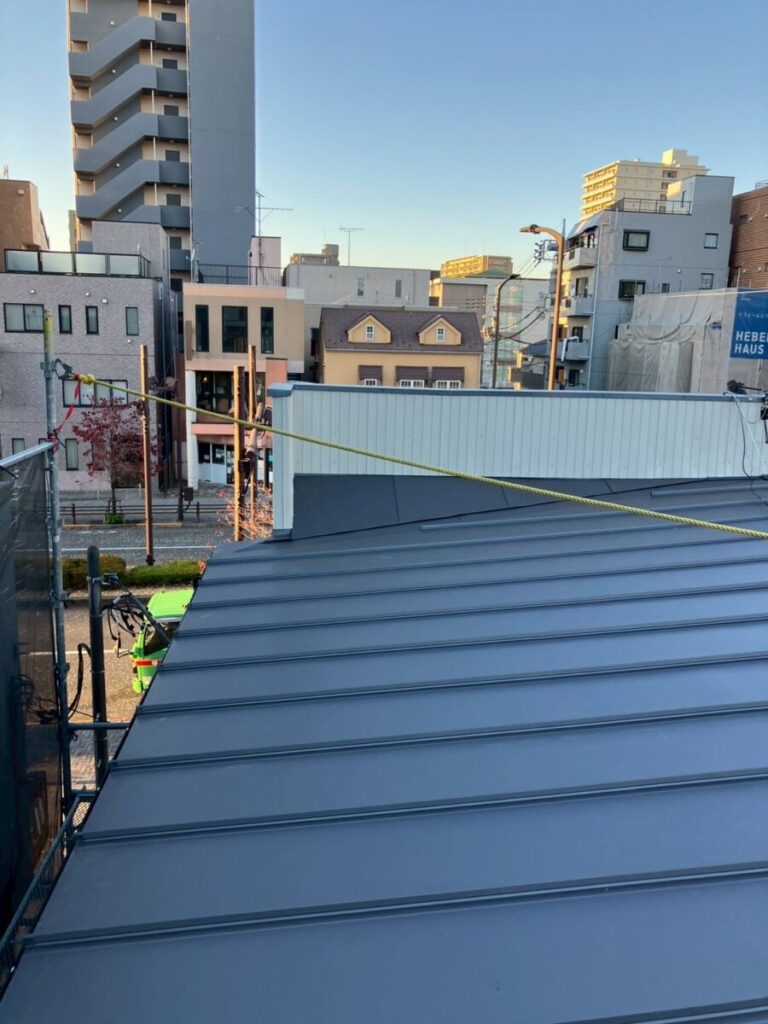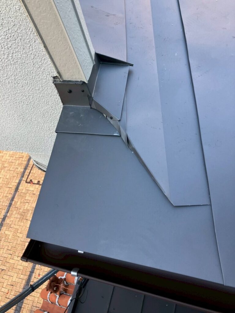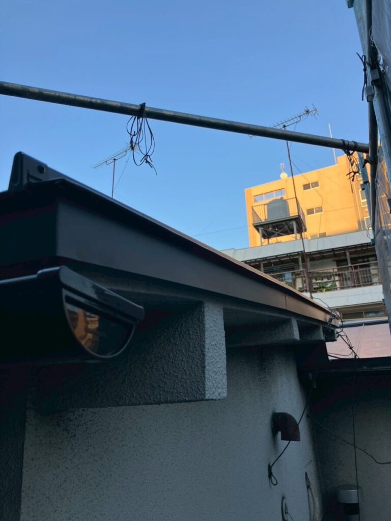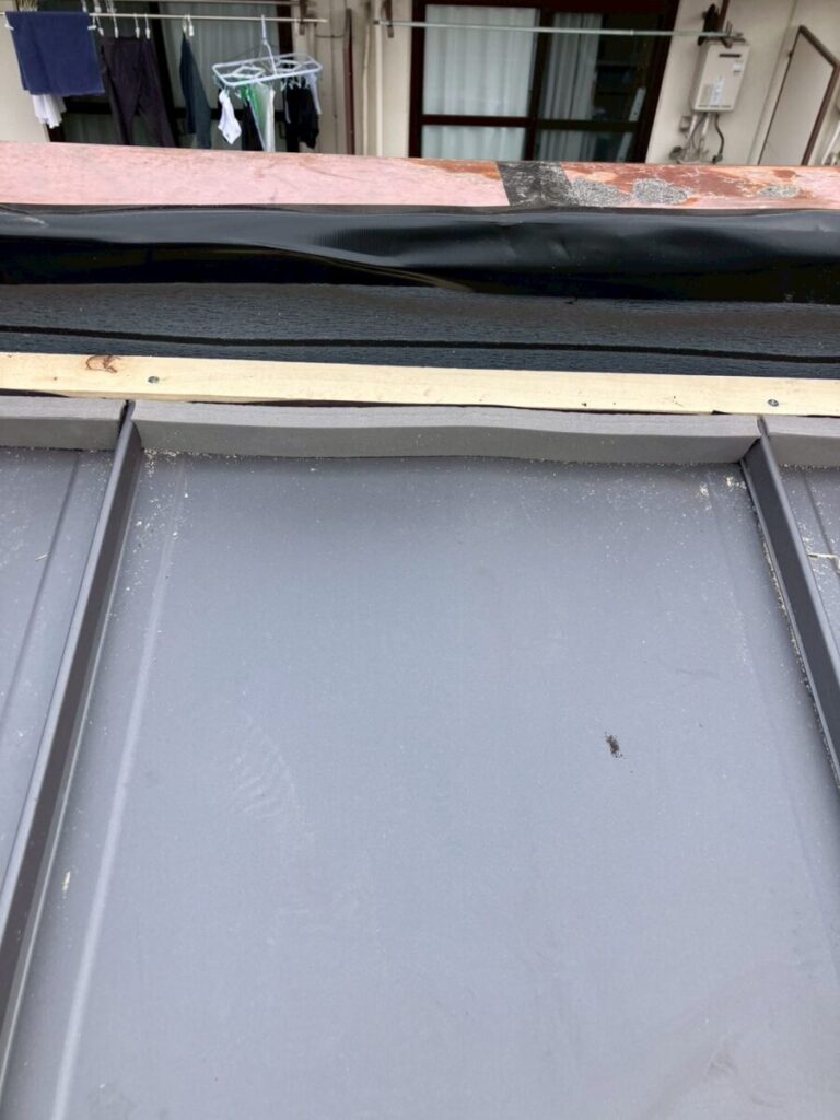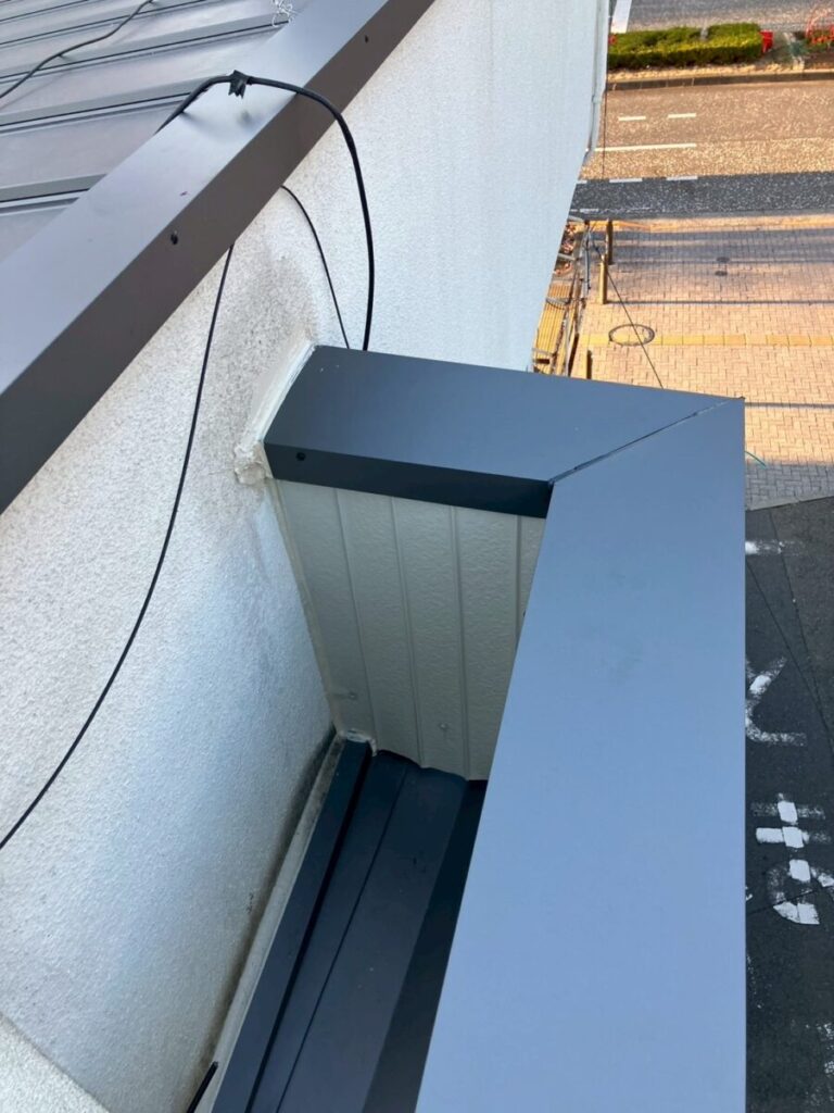 笠木などの板金も順番に取り付けていき、屋根と絡む立上り壁の板金も今回すべて交換しました。雨漏りの原因になりやすい場所なので、下地の状態も確認しながら、納まりと防水性を最優先で施工しています。見た目はスッキリしていますが、中身はかなり気を使って作り込んでいます。