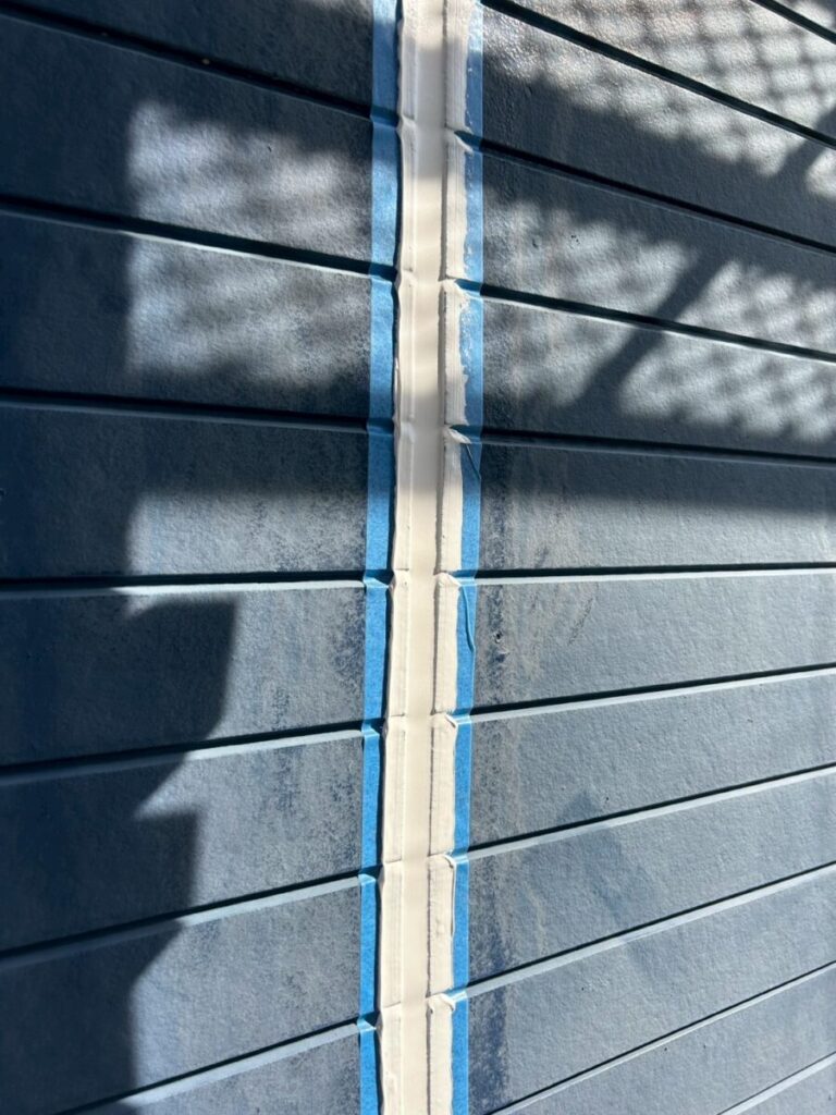 その後、目地の両側にマスキングテープをまっすぐ丁寧に貼り、プライマーを塗布。