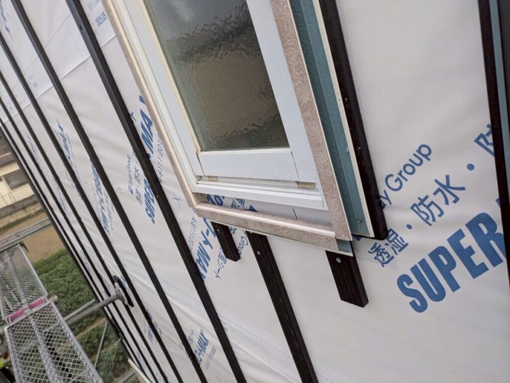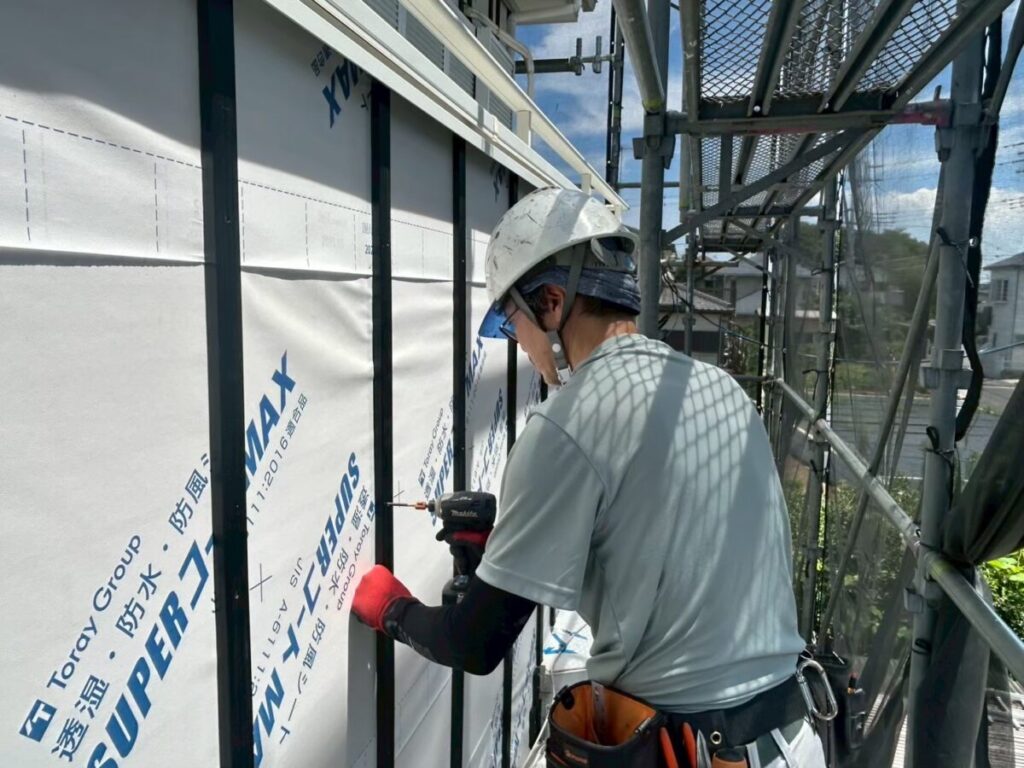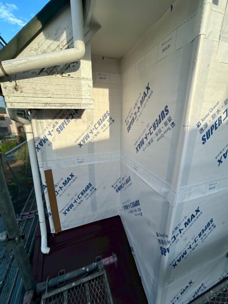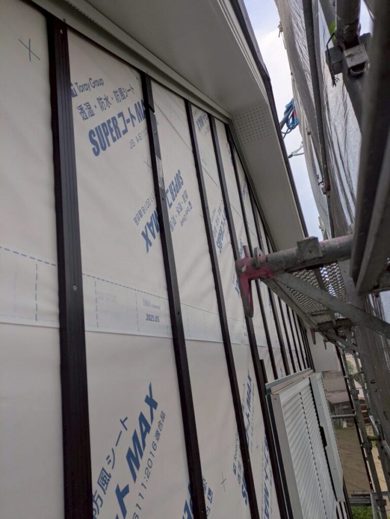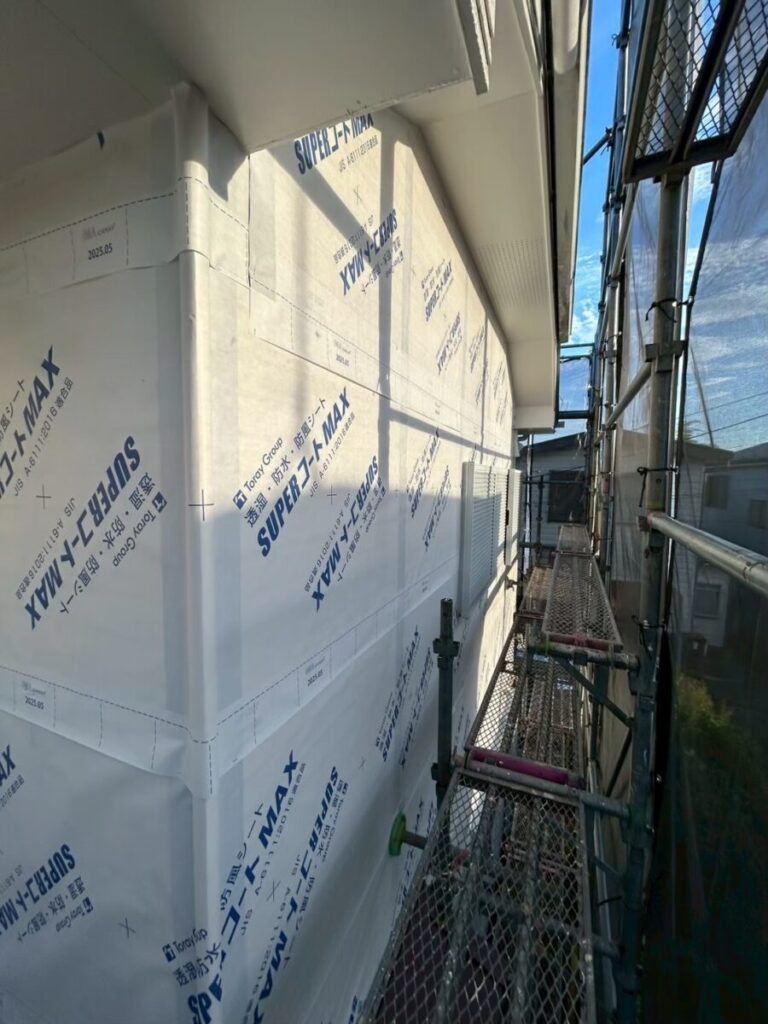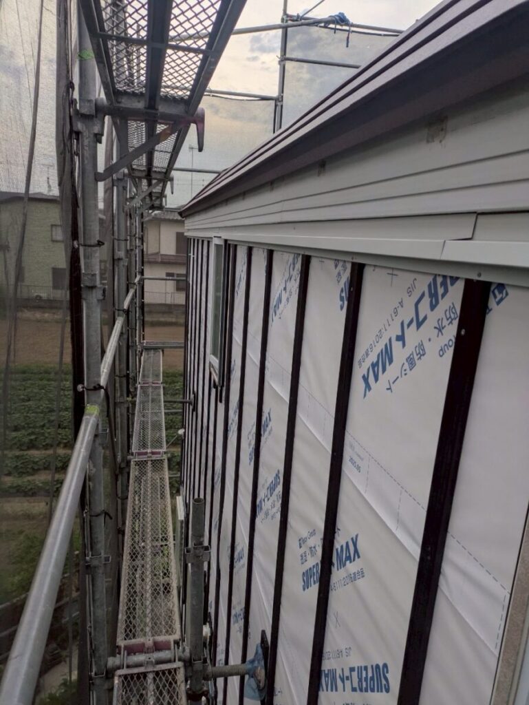 今回は、既存壁の劣化が激しかったので、防水紙を貼りました。
