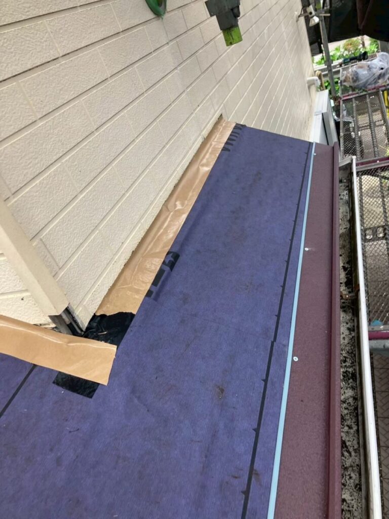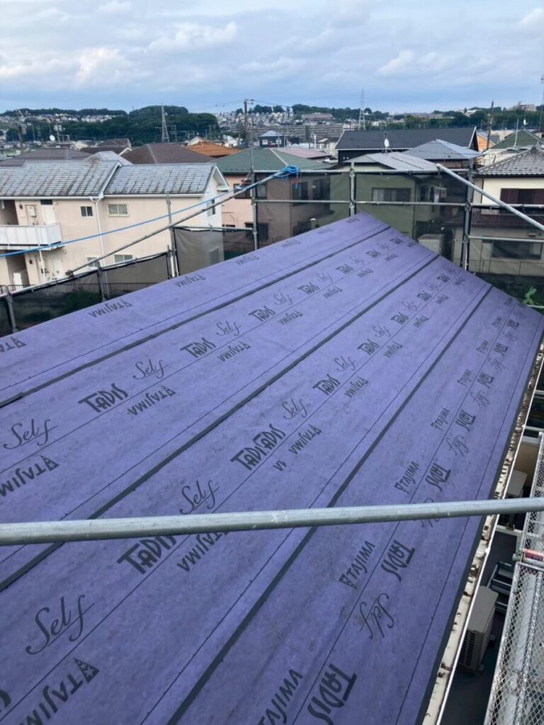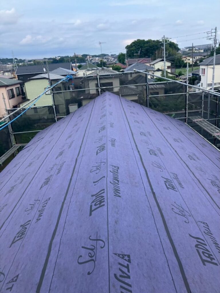 防水シート(タジマタディスセルフを使用)を屋根全面に貼っていきます。