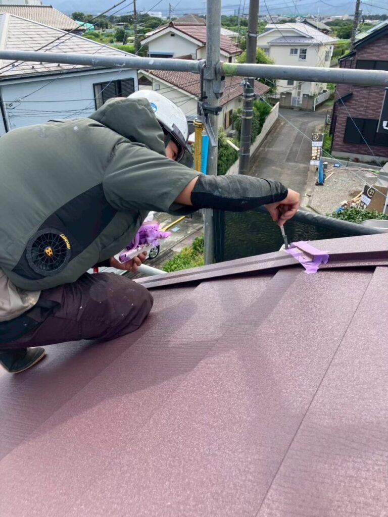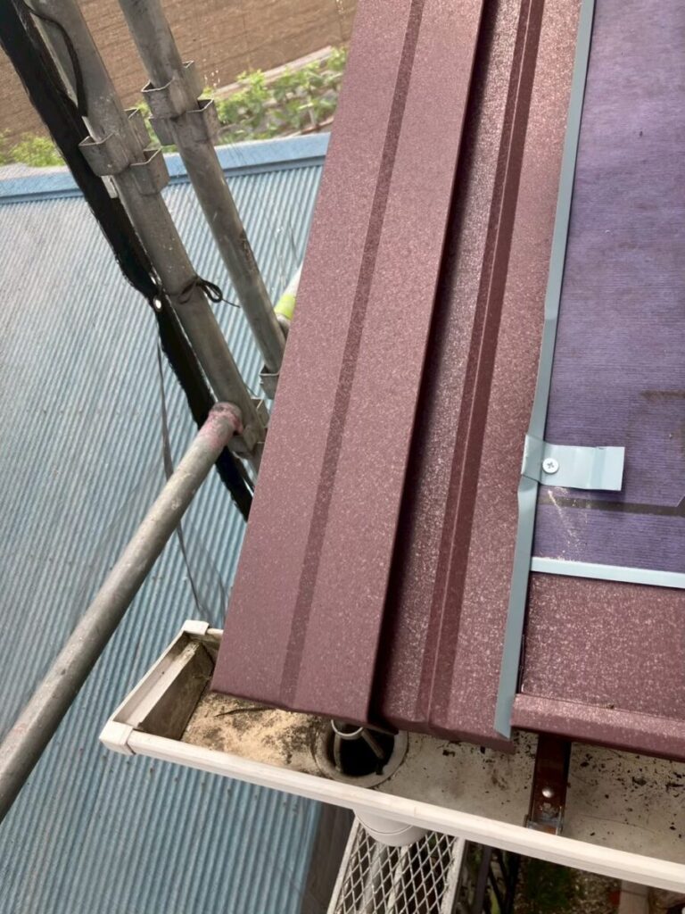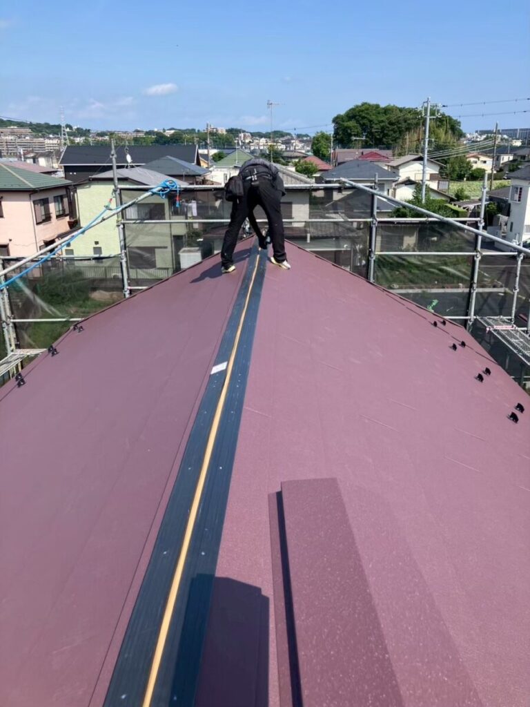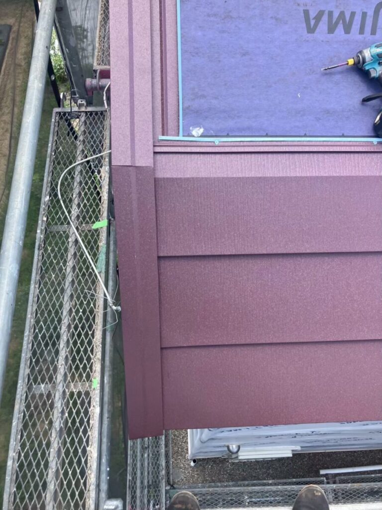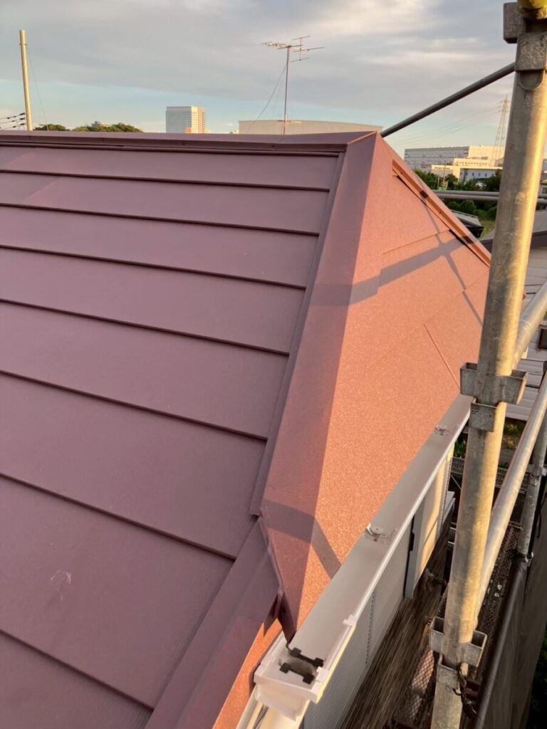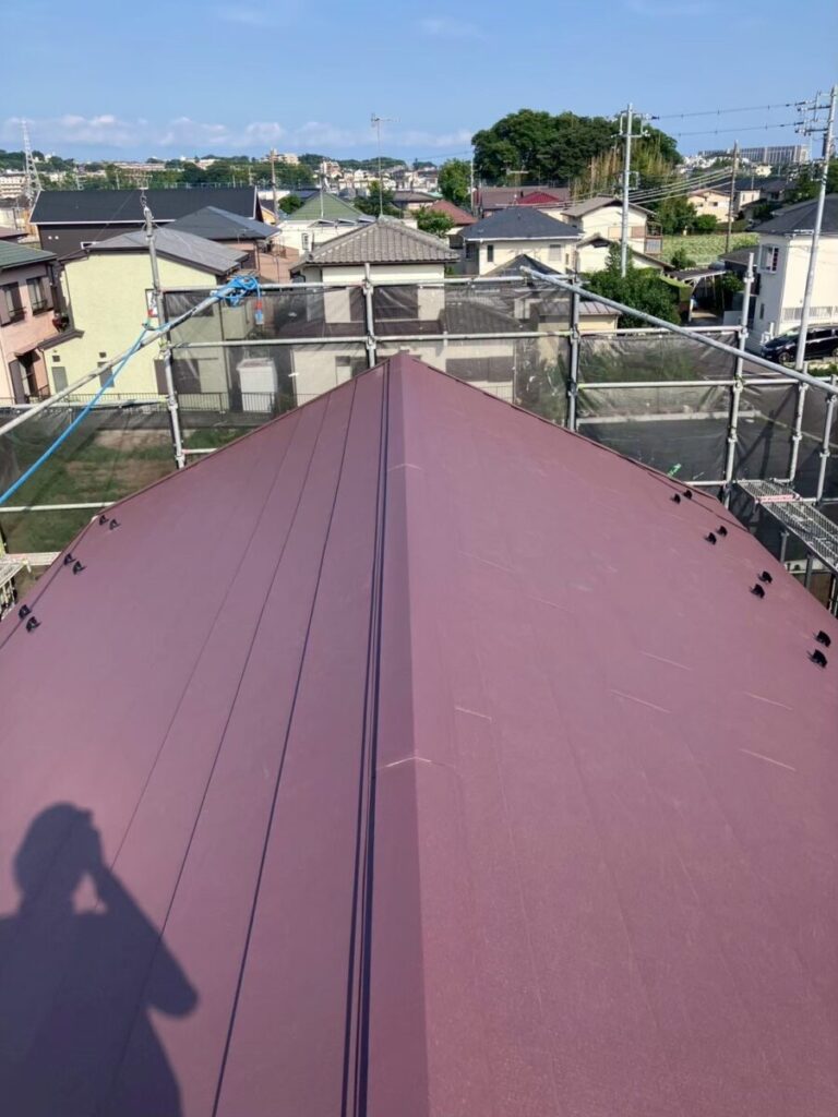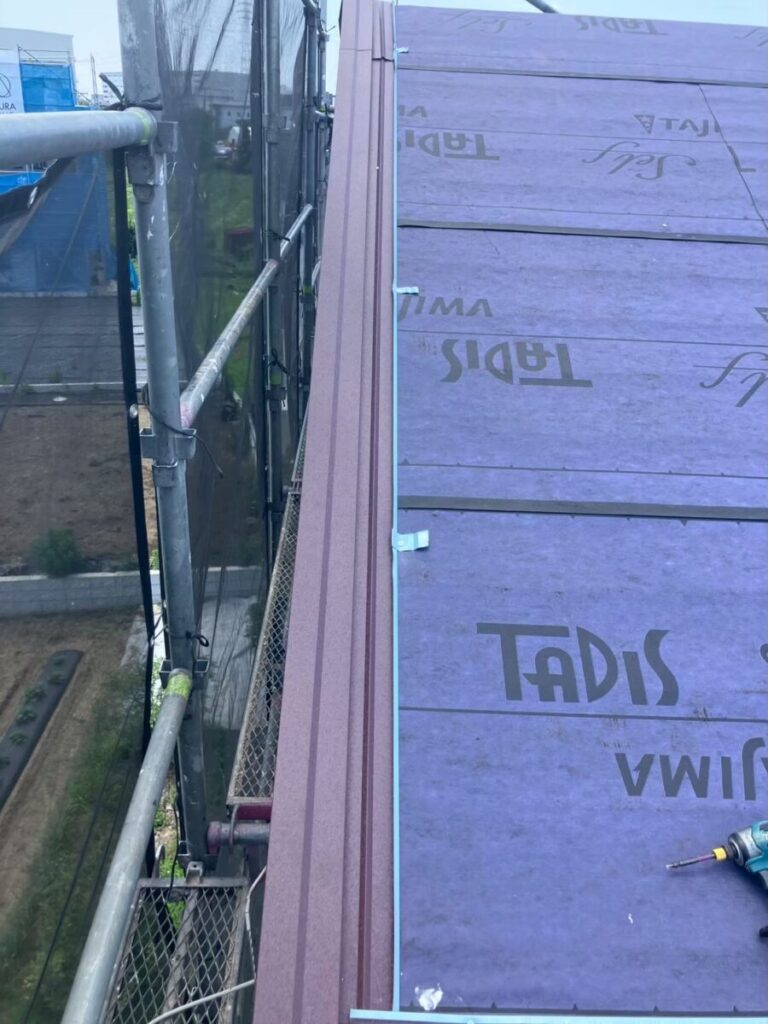 屋根材はアイジー工業の「スーパーガルテクト」ワインレッドを使用。